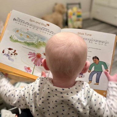 Here, an adult hand holds the Music Together songbook, while that beloved grown-up sings to the baby... look at the baby's hands move with excitement!